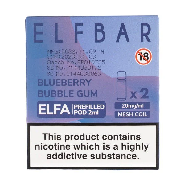 The Elf Bar Blueberry Bubblegum Prefilled Pods are designed for use with the Elf Bar Elfa pod kit only. Enjoy sweet and sharp notes of ripened blueberries wrapped in creamy candied bubblegum.