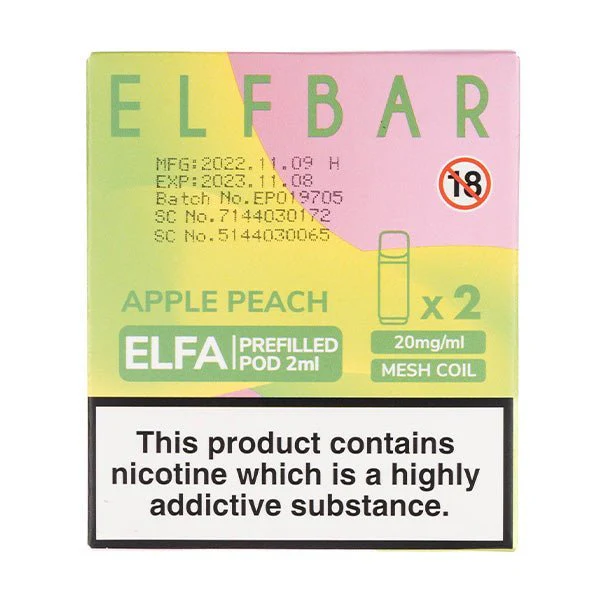 The Elf Bar Apple Peach Prefilled Pods are designed for use with the Elf Bar Elfa pod kit only. Enjoy flavours of crisp sharp apples and smooth & floral peaches, with perfectly balanced sweet and sour notes.